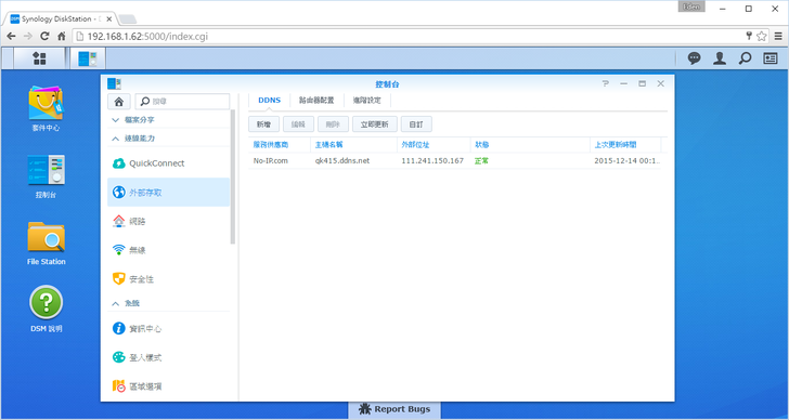 在此筆者建議用DDNS直連NAS,首先必須先到DDNS的服務供應商申請一個帳號(如:NO-IP,當然Synology也有提供它自己的ddns),並設定好host;在這邊只要輸入IP和帳密即可,如果家裡是動態IP,Synology會自動同步IP至DDNS。