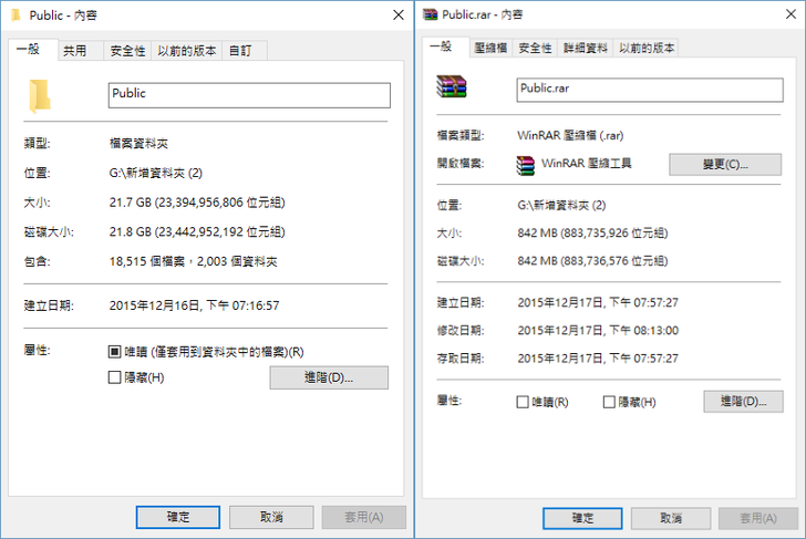 【檔案壓縮】以下將測試檔案壓縮的效果與功能,筆者先用電腦將Public檔案做未壓縮與壓縮後的比較,從下圖可知,未壓縮的檔案為21.7GB,而壓縮後則為842MB。