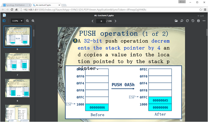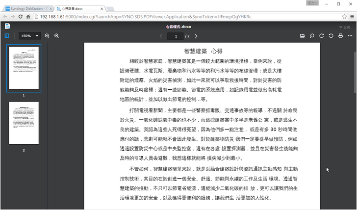 【文件檢視器】DSM也有線上文件檢視器的功能,如此一來,使用者不用為了每次要檢視文件還要特地下載下來。像筆者本人電腦內的Download資較夾就有一堆檔案,文件大約就佔了六成吧,而且本人也懶得整理...此外,電腦內沒有裝Offfce或是PDF Reader的,利用文件檢視器看文件就非常方便。如下圖,它支援Word, Powerpoint, Excel, pdf, txt等文件。