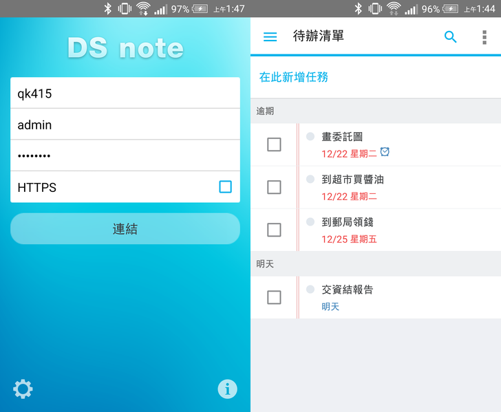 【Note Station】筆者認為在Synology裡,最實用的生產力工具就是Note Station了!!!如果善加利用這個套件,相信一定對生活更加便利~下圖看到的是代辦清單,只要在"按此新增任務"欄位打好要辦的事,並選好截止時間,甚至還可以選擇提醒的時間,非常簡單。