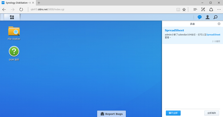 新的DSM 6.0在介面上沒做太大的改變,不過下方有一個"Report Bugs",讓有發現問題或疑問的使用者在第一時間可以做詢問和反應。
