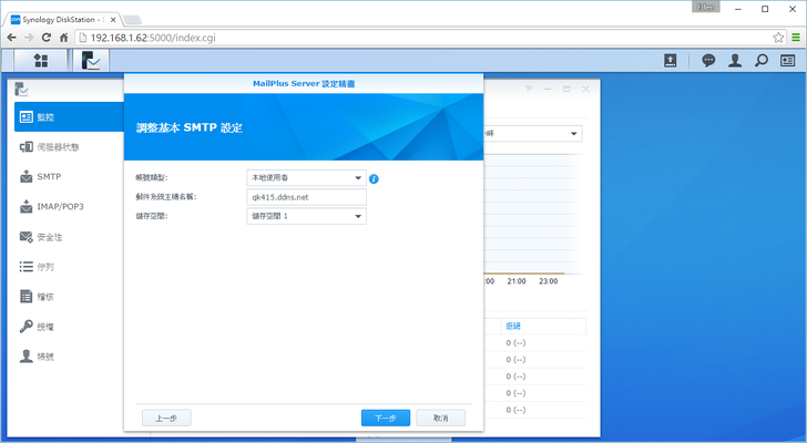 不過像是管理員帳號admin的信箱就會是admin@qk415.ddns.net,因此這裡STMP可以設定自己喜愛的別名(帳號),如asd888@qk415.ddns.net其實就是寄給admin這個使用者,或是設定寄給多名使用者。若是想將郵件轉寄到gmail, yahoo等信箱,可以利用"外部信箱"來設定。
