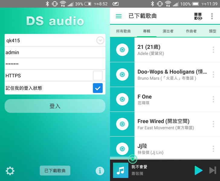 「DS audio」是Audio Station的手機app版,由於登入播放後的音樂會自動下載下來(預設值),因此在未登入的情況下,可以看到一些本裝置已下載的歌曲。