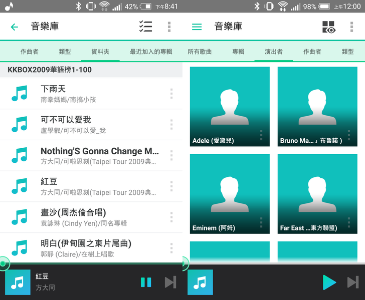 成功登入後,音樂有依作曲者、類型、專輯等做分類;瀏覽模式也可以切換為縮圖。