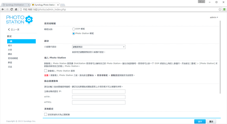 如果想要分享這個相簿,而不透過DSM帳號的話,建議將帳號系統更改為"Photo Station帳號"。如此一來,管理員就能為不同帳號建立不同的相簿觀看權限。