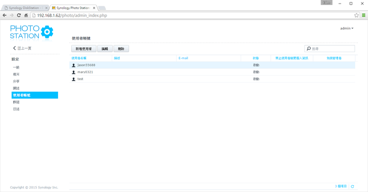 在使用者帳號的地方可以建立不同的帳號,並為其帳號指派每一個相簿的權限。