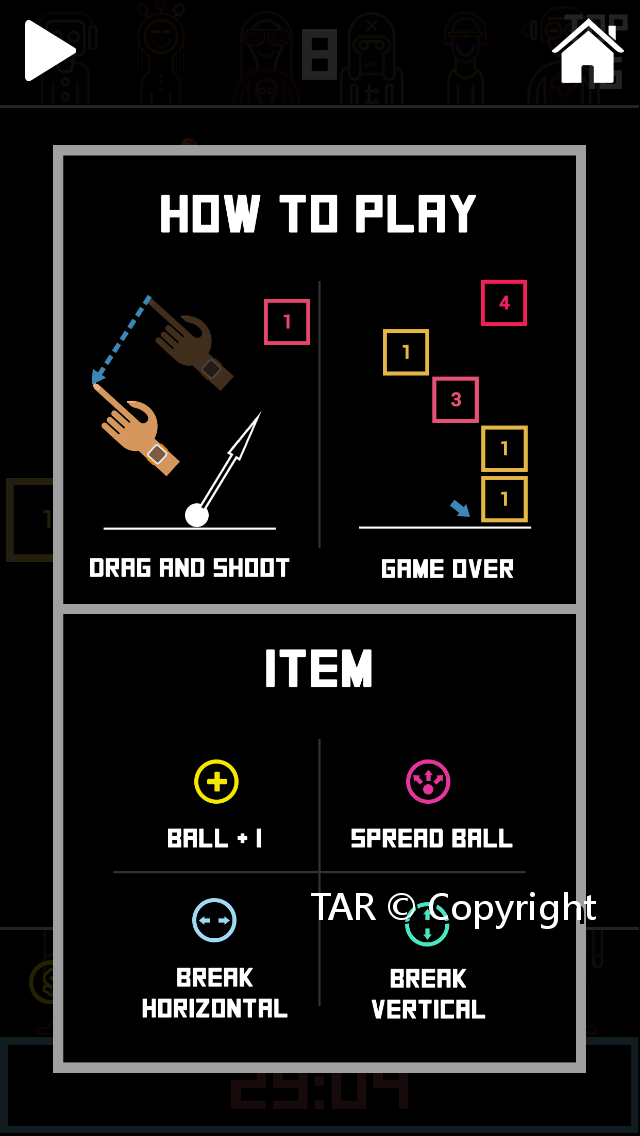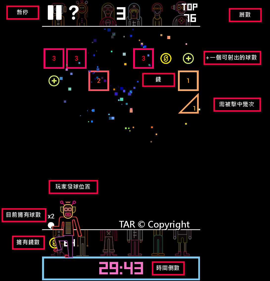 玩家手上的白球以手操控角度射擊,觸碰上方數字方塊後將之擊碎,每個方塊上的數字代表著需要擊中多少次以達到破壞;當球下墜時會回到玩家手中,不會反彈,必須進行下一次的瞄準,碰到⊕可增加手上1顆球數,碰到$則增加一塊錢。