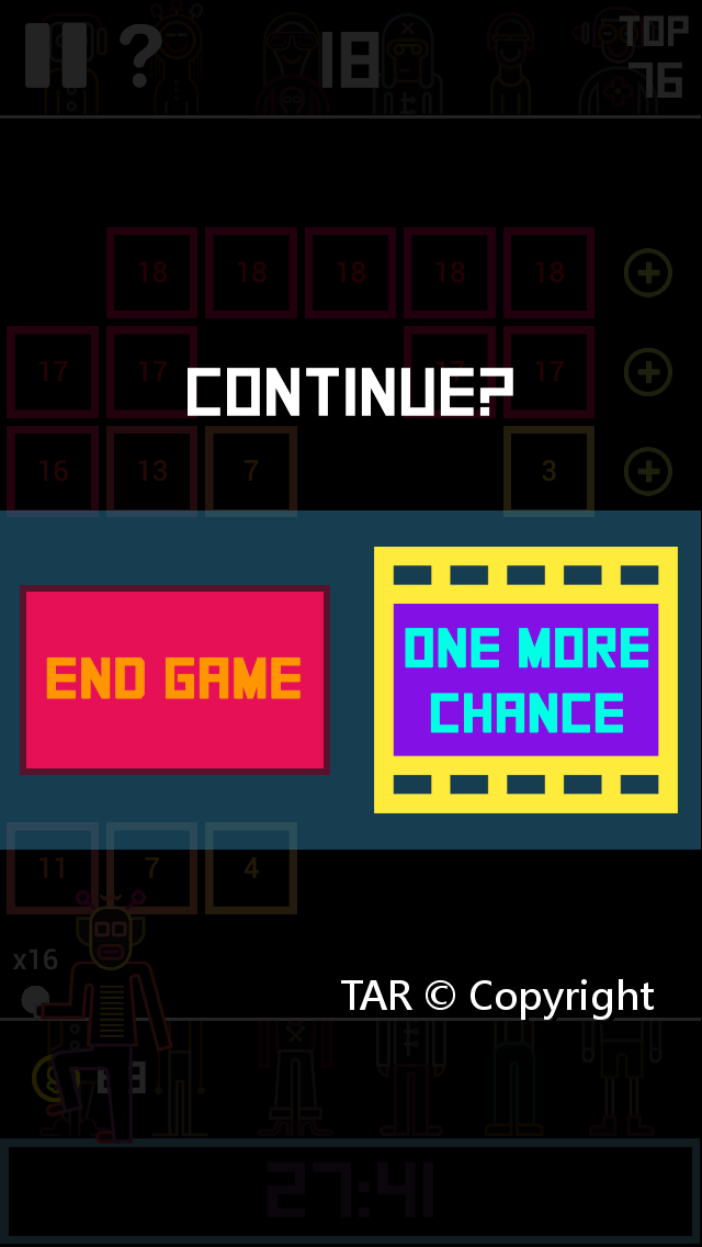 每當球回到玩家手上,方塊就會向下一層,碰到最底層就GAMEOVER,官方很貼心的讓你有一次復活機會,前提是看一小段影片,水幫魚魚幫水嘛!