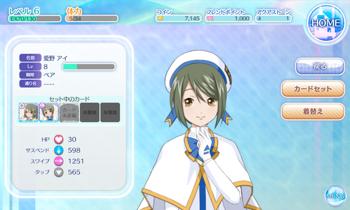 角色資料畫面除了名字等級外,下面就是可以裝備角色卡片的地方,也是角色主要屬性來源,各種屬性會對應不同判定增加能力喔!另外在右邊的著裝處也可以幫角色更換衣服,不過衣服不容易入手就是了,目前正在舉辦浴衣的活動,可以獲得特別的服裝!有興趣的玩家不妨可以趁現在近來遊戲看看囉。