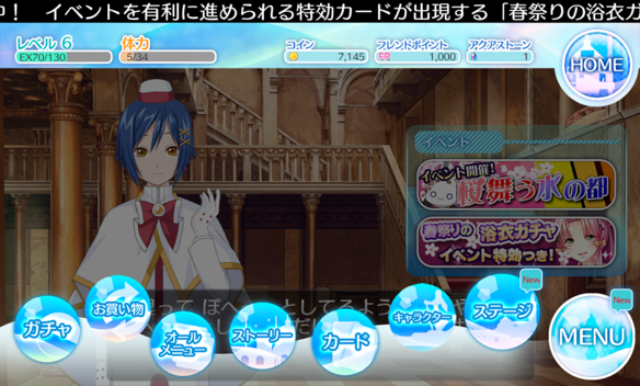 遊戲畫面左右下角兩邊各有兩個大功能按鈕,左側的項目如上,分別是公告、禮物、任務,而右側的項目可以參考下圖,比較長,分別是轉蛋、商城、其他功能、故事、強化、角色、音樂(關卡)。