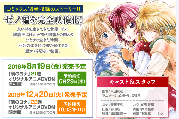 由漫畫家草凪瑞穗原作,漫畫累積發行部突破330萬的作品《晨曦公主》於今日發表即將再次推出OAD的消息。OAD內容為漫畫第18卷當中的「傑諾篇」前後篇完全映像化。DVD將在2016年8月19日所發行的第21卷和12月20日發行的第22卷的限定版附贈。
