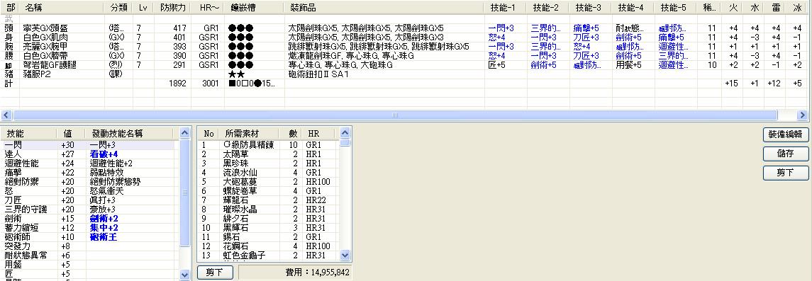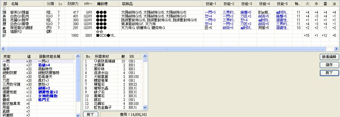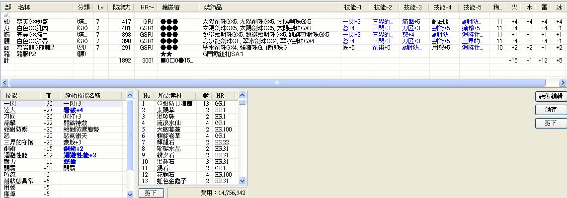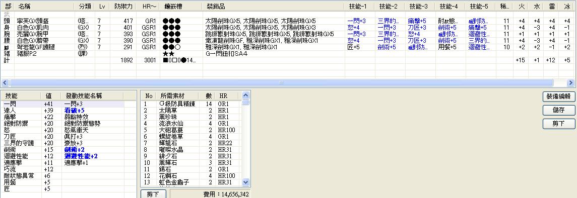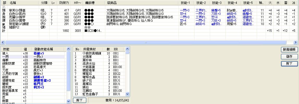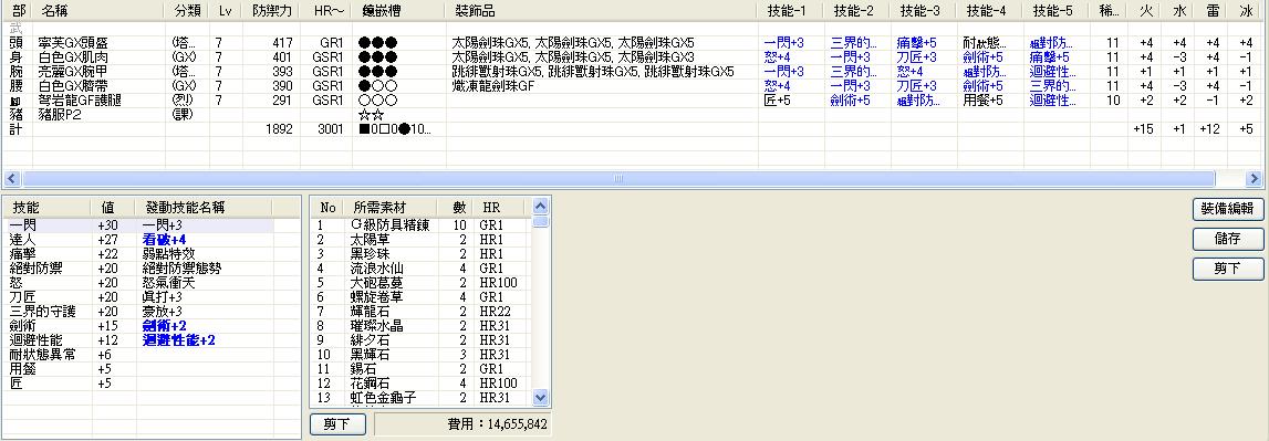防禦力:1892 鑲嵌槽:■0□0●14○1 火:15 水:1 雷:12 冰:5 龍:-4