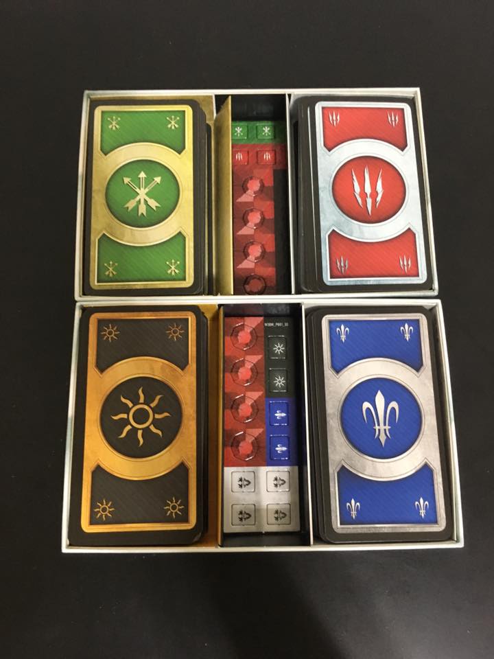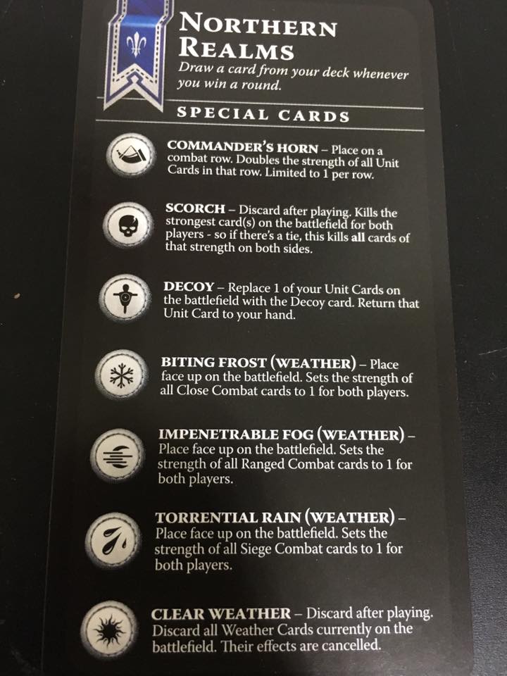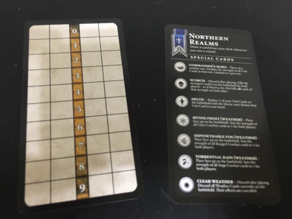 打開後有兩副牌 黑黃的是尼弗迦德帝國 藍白的是北方王國,中間的小卡就是給你記分用跟陣營的小道具