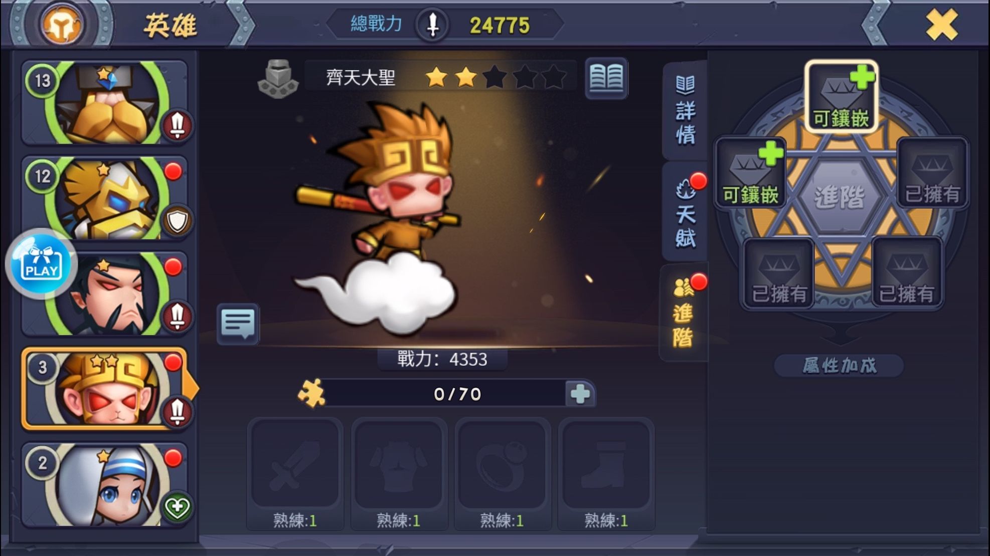 另外遊戲內也有寶石鑲嵌系統,玩家可以在遊戲通關時獲得的寶石會分為「陽、雷、雨、風、星空」這五種位子,然而在蒐集滿五種位子的寶石時,只要玩家按下進階鈕,寶石就會自動合成,幫助該角色屬性加成,像是屬性加成中就會有攻擊力加成或者是生命加成,雖然數字都很小,但積少成多,對於追求完美的玩家,寶石鑲嵌系統絕對會是你需要注意的地方!