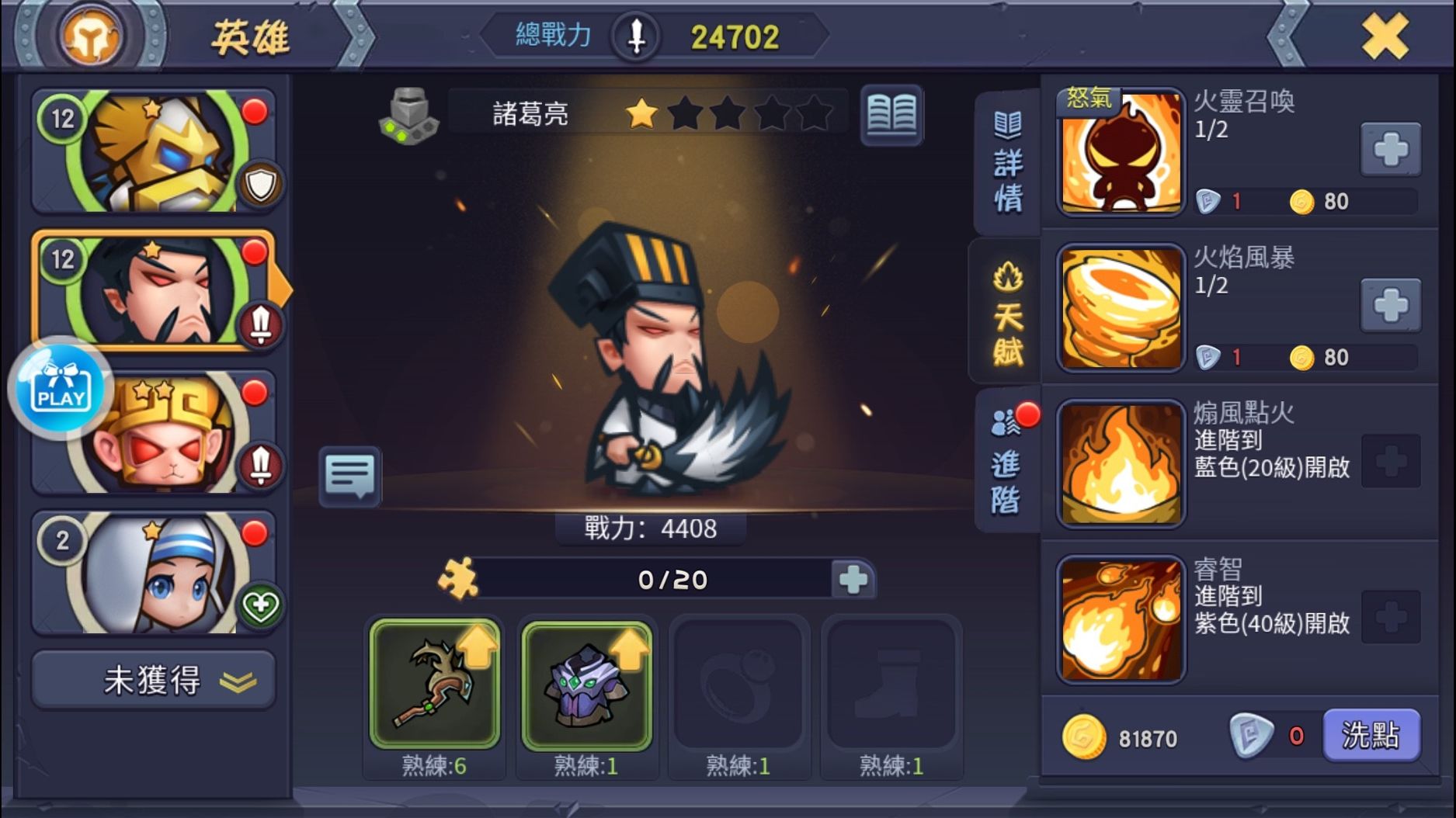 再來每一隻角色都會有自己所謂的天賦系統,在天賦系統裡每個角色都會有四招技能,分別為怒氣技能(怒氣值滿的時候可以使用,傷害最高)、召換技能(顧名思義就是在角色噴射出去時可以使用的技能,傷害第二高)、普攻技能(會使角色在普攻時有特別的效果,比如說有機率讓敵人著火等等)、被動技能(爆擊、反彈傷害,閃避率等等就是在這個技能裡面),而玩家可以依照每個技能的不同點選你自己想要的技能取向,深怕自己點錯的玩家也不用擔心,遊戲內很貼心的準備了洗點功能,只要花費玩家30鑽石即可將點錯的技能點數洗掉重點囉!