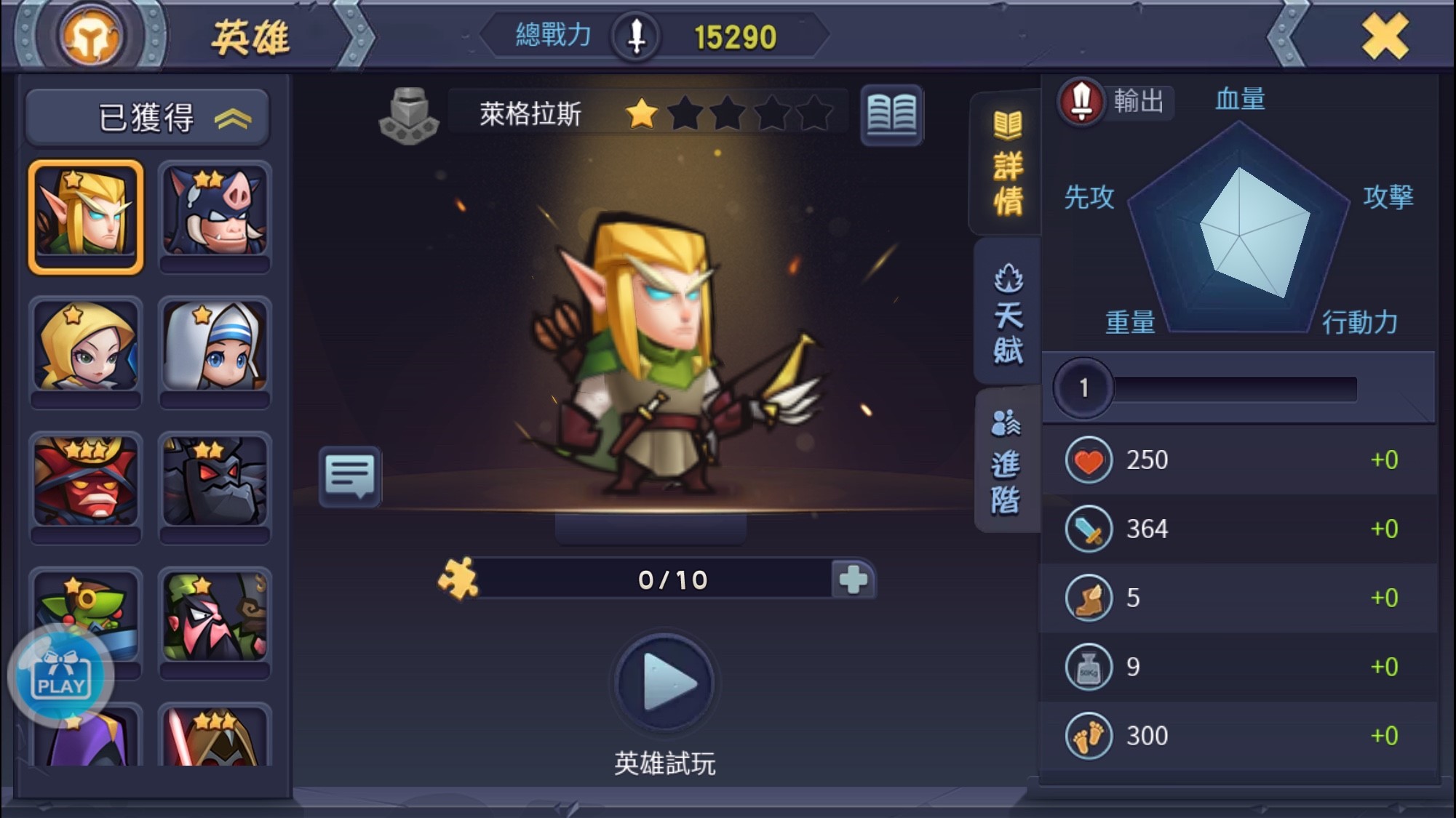 遊戲內還有一個非常特別的系統,那就是英雄試玩系統,讓玩家先體驗過英雄,再來玩家就會因為試玩到喜歡的角色進而抽,抽不到就會想要儲值直到抽到為止,這一招可以說是高招啊!不僅省去玩家查詢英雄有什麼技能的時間,也可以讓玩家因為提前試玩而提高課金的機率,重點是,這個系統不用花費玩家任何一毛錢,你想試玩幾次就試玩幾次,花費的只有手機的電力而已!