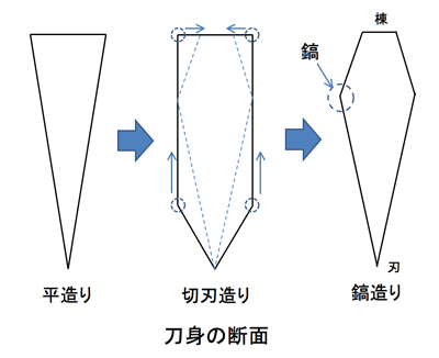 切刃造 ─ 鎬更朝向刀鋒的方向的造型(上古刀中常見)。