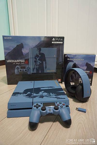 限量成套一整組《秘境探險4》的PS4+藍芽耳機組+酒壺,擺在一起有夠威的~