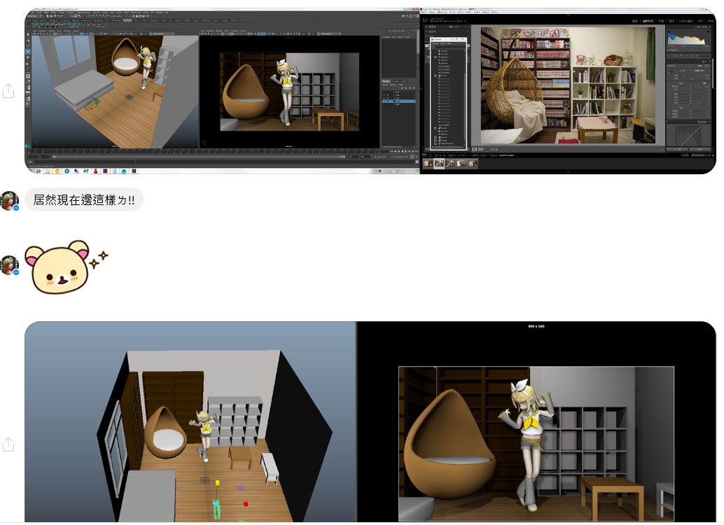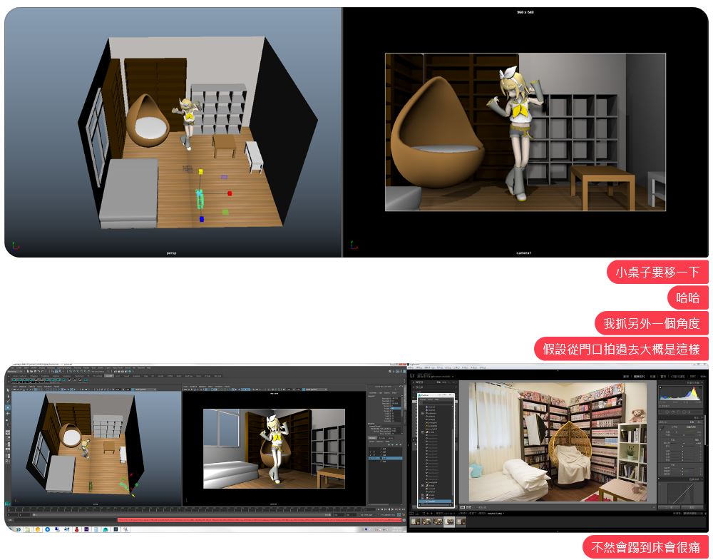 另外還有小桌子與床的問題,為了跳舞的過程能確保這段舞蹈在跳的時候不會踢到腳,還將MMD的數據導入MAYA來模擬一次,確認這樣的構圖跳起來是安全的,有了這樣拍攝規劃後到了現場就是等妝畫好開始拍了,花最多時間的反而是左手邊那坨玩偶小埋抱枕,平時家裡就收得很乾淨要擺個生活感超難的....甚至一度想打電話請教美術場景的朋友.