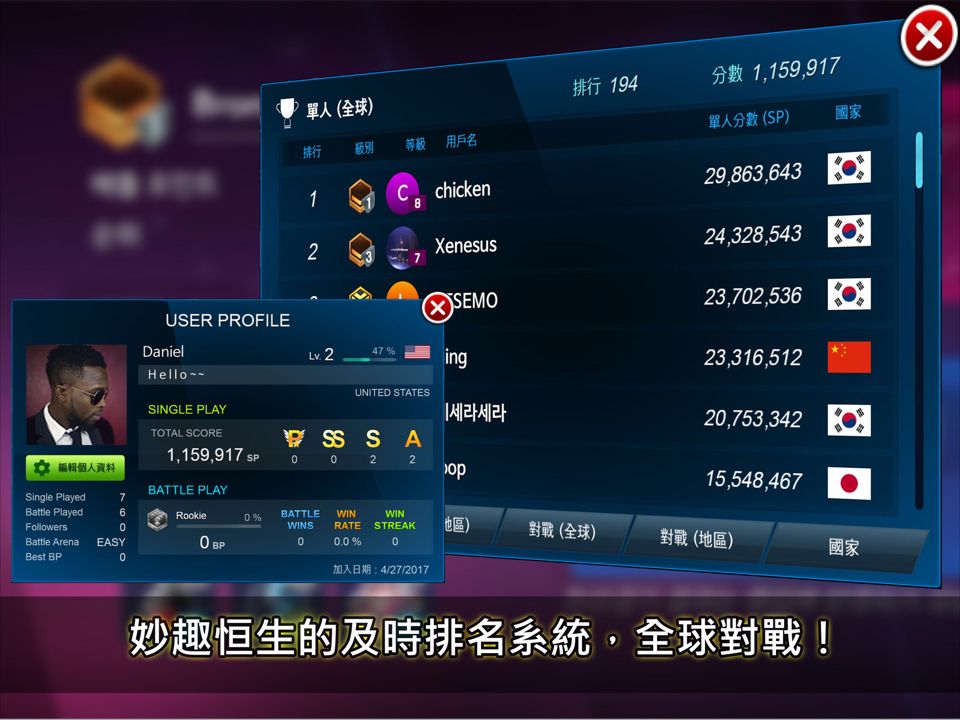 - 一個實時的排名系統,您可以將記錄與全球玩家進行比較