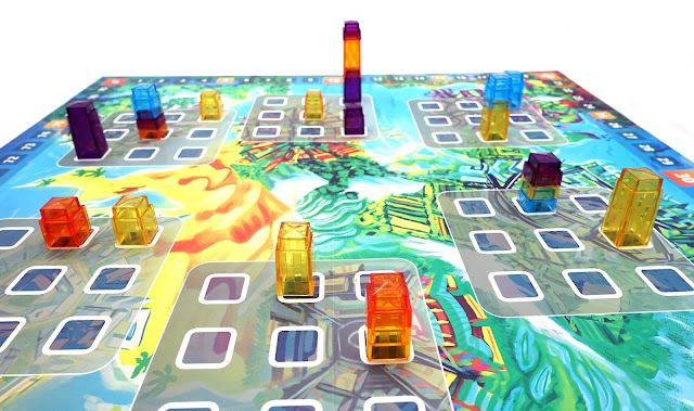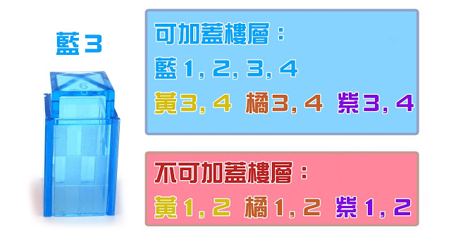 (以上面這張圖來說,這棟三層樓本來就是藍色玩家的,所以他要在上面加蓋任何高度的樓層都可以。但是其他顏色的玩家如果想在上面加蓋,樓層就必須大於等於三層才能蓋。)