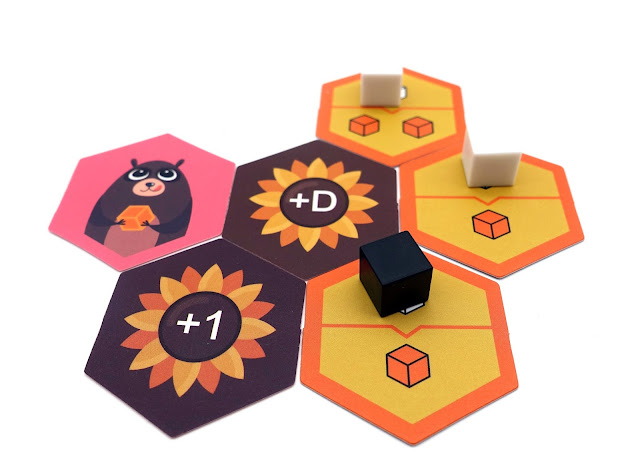 ▲愛蜜熊板塊的功用則是會把周圍所有的蜂巢卡上的蜜蜂都趕回家,並且會把那些蜂巢板塊翻面變成花園板塊,此後愛蜜熊的周圍也不能再擺放任何蜂巢卡。