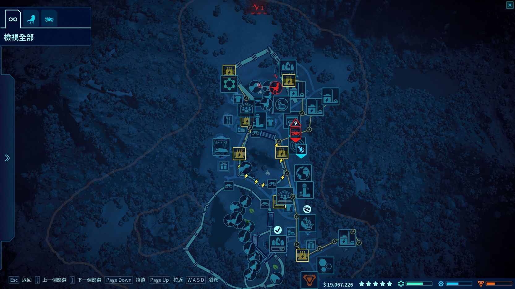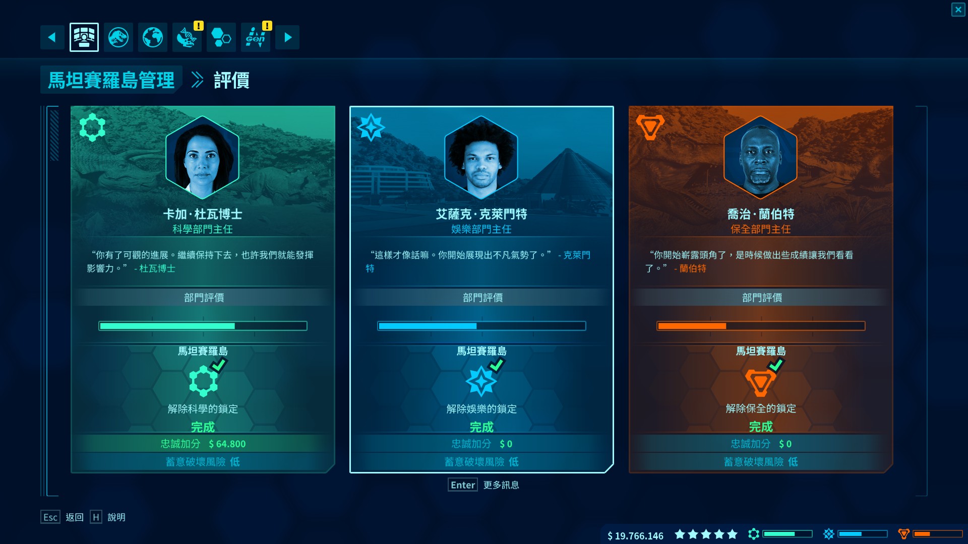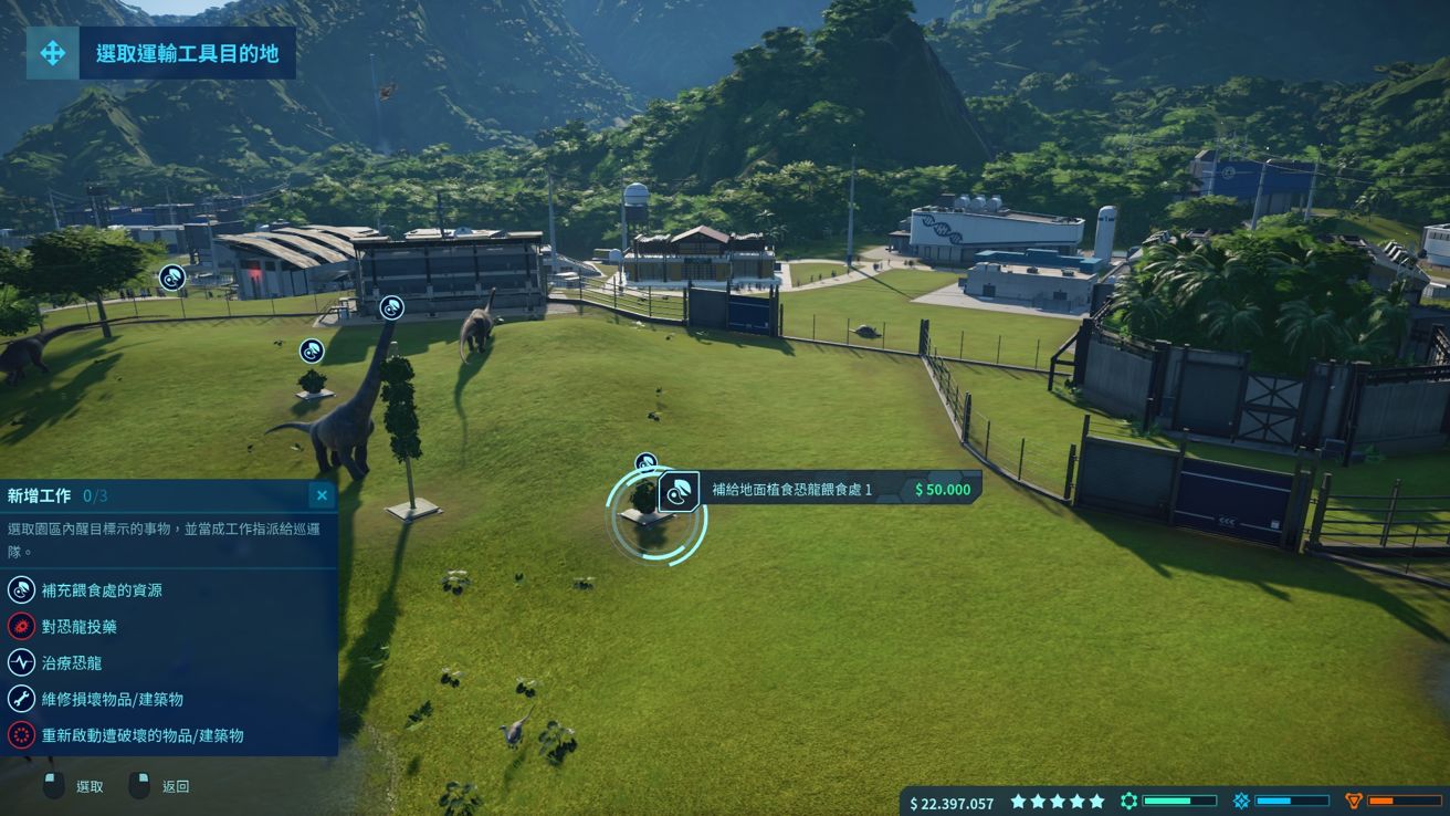 侏儸紀世界:進化 承襲上一代的玩法 但當中追加部門競合 承包任務 細項分列遊客整體需求
