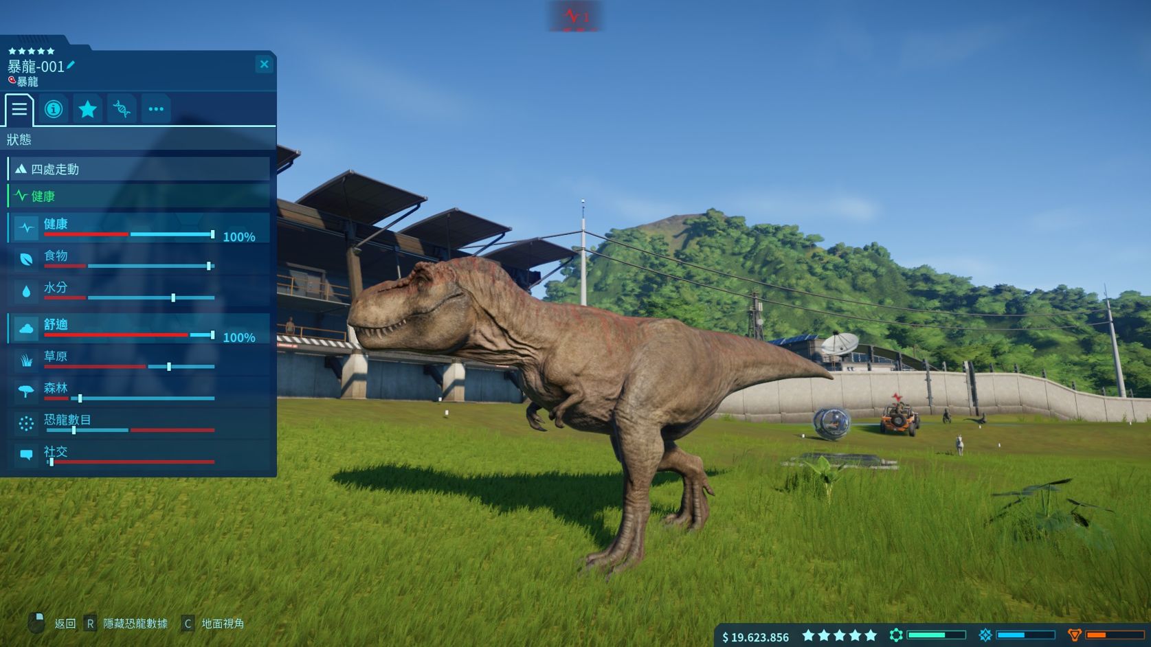 各項數據影響著恐龍的舒適度 當恐龍舒適度降到紅條甚至歸零時便會試著逃出圍欄