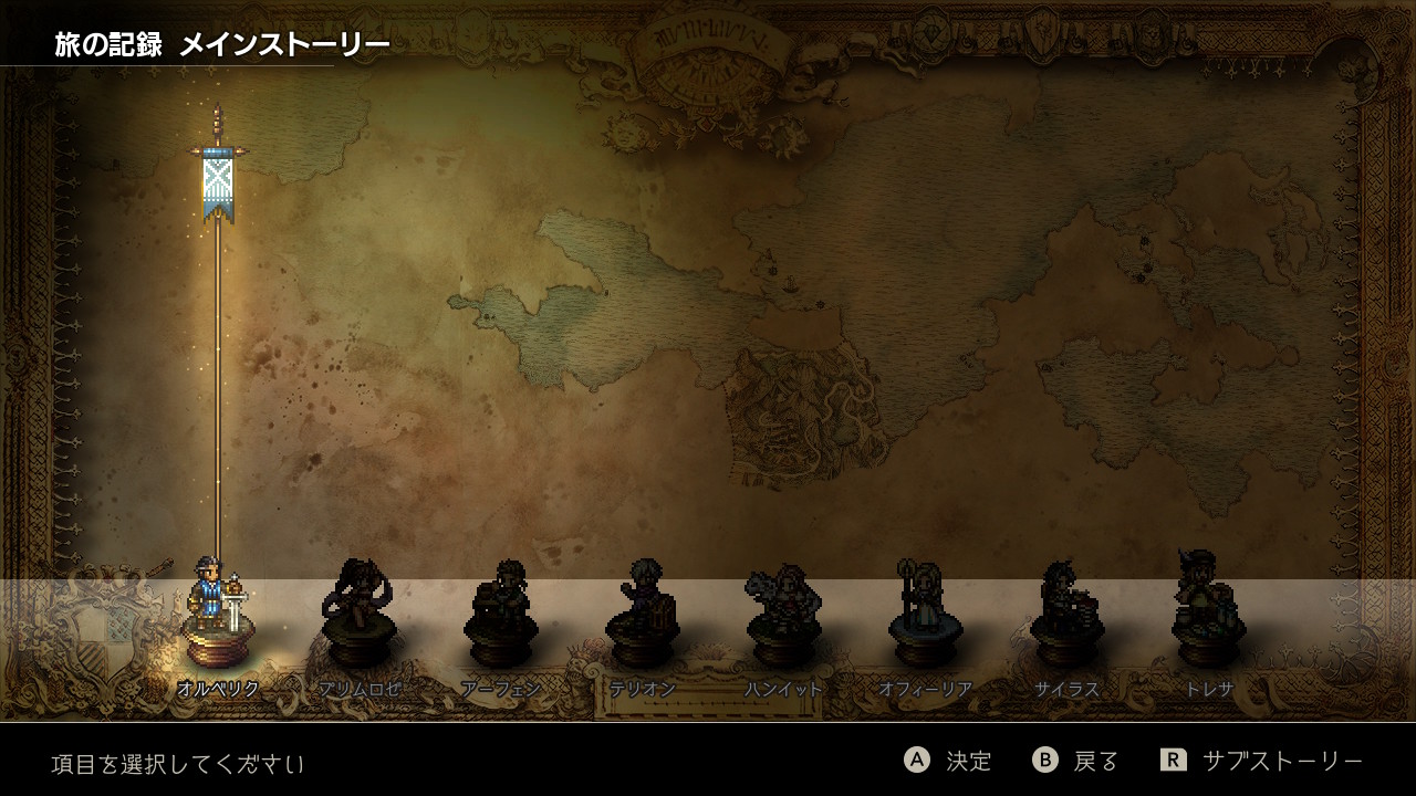 開始新遊戲後,地圖上有著八位主角可以選擇,玩家可以選擇其中一人開始進行遊戲,官方是說遊戲可以只玩一次就把八位角色的劇情完成,差別只是在於可能每個人會遇到覺得困難的地方不同.