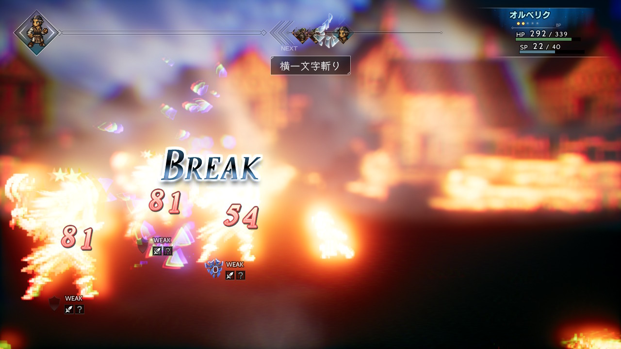 當弱點武器、屬性命中後,敵人左方盾牌便會減一,若歸0則會造成破防,敵人會一回合無法行動,並且受到的傷害加大,因此玩家可以多多善用此點技巧.