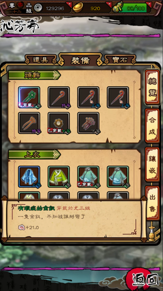 遊戲主要玩法以養成為主,因此許多的道具、裝備都可以自己合成。在系統沁芳亭中玩家可以觀看自己目前擁有的道具、裝備與寶石,進行合成或是其他的應用,也可以進行寶石的鑲嵌,是遊戲玩法中相當重要的部分。