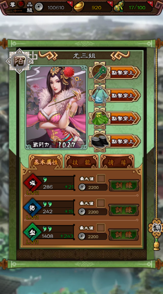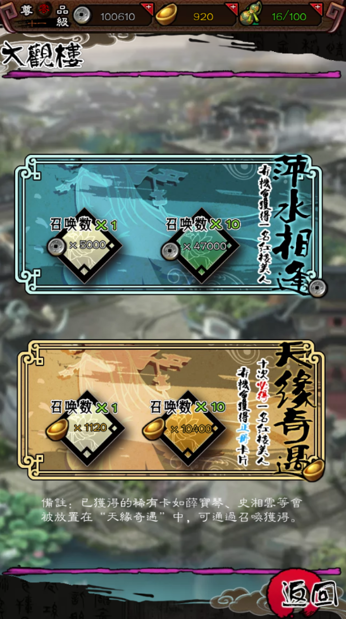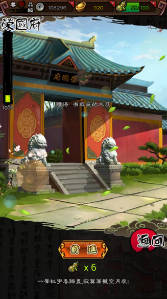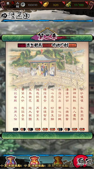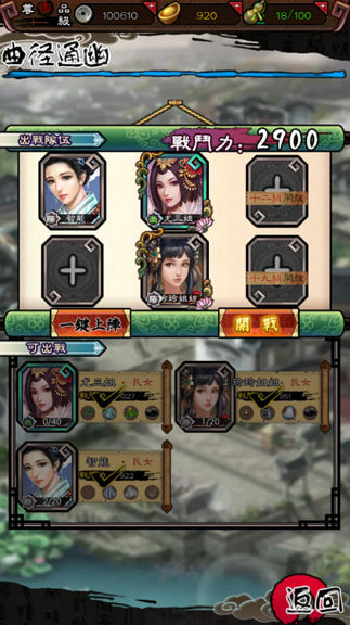 遊戲中的關卡推進主要在曲徑通幽進行,關卡名稱設計也非常有詩意。選擇關卡之後可以選擇上陣角色,隨著等級的提升,最多可以開到六位角色上陣。遊戲戰鬥進行方式非常的輕鬆簡單,系統會自行戰鬥,所以玩家主要需要做的就是角色的培養,遊戲以觀看劇情、養成角色為主軸。