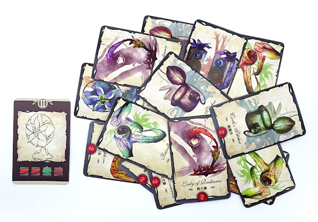 ▲植物卡都是雙面的,這是其中一種植物【燭台蓮】,背面用的是素描的方式,下面標示種植時所需要的種子;正面則是很美的彩圖,與可以獲得的分數。