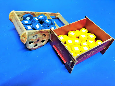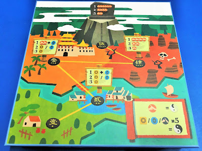 把回合指示物放上去的感覺是這樣,回合旁的告示牌是標示武鬥會前三名的獎賞,右下角的卷軸則是告訴你怎麼計分的簡圖,1個使用過的「尊敬」算0.5分,其餘物資(錢、酒、使用前的尊敬)則是累積5個才算1分。