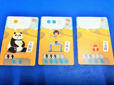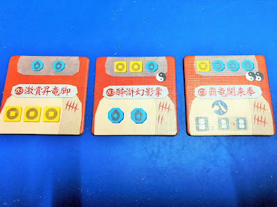 起始弟子卡和追加弟子卡,右上角是表示武力的標記,下方則是鍛鍊需要的資源,破掉的太極圖在遊戲結束時可是會扣分的。