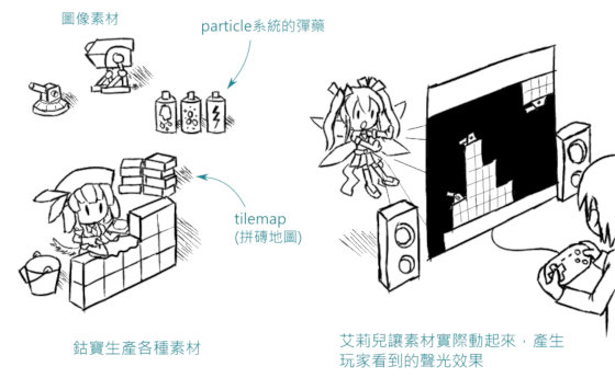 做遊戲的過程中覺得一個遊戲引擎除了用來執行遊戲的本體以外,配合的輔助工具也很重要,沒有輔助工具只有引擎本體也難以做出成品,所以設計成兩人組。
