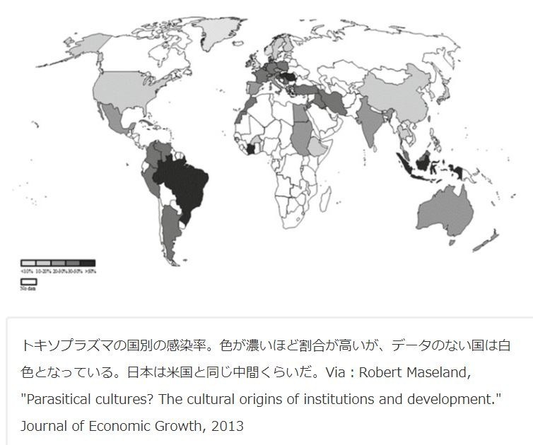 ※4:Jaroslav Flegr, et al., "Toxoplasmosis- A Global Threat. Correlation of Latent Toxoplasmosis with Specific Disease Burden in a Set of 88 Countries." PLOS ONE, Vol.9, Issue3, 2014