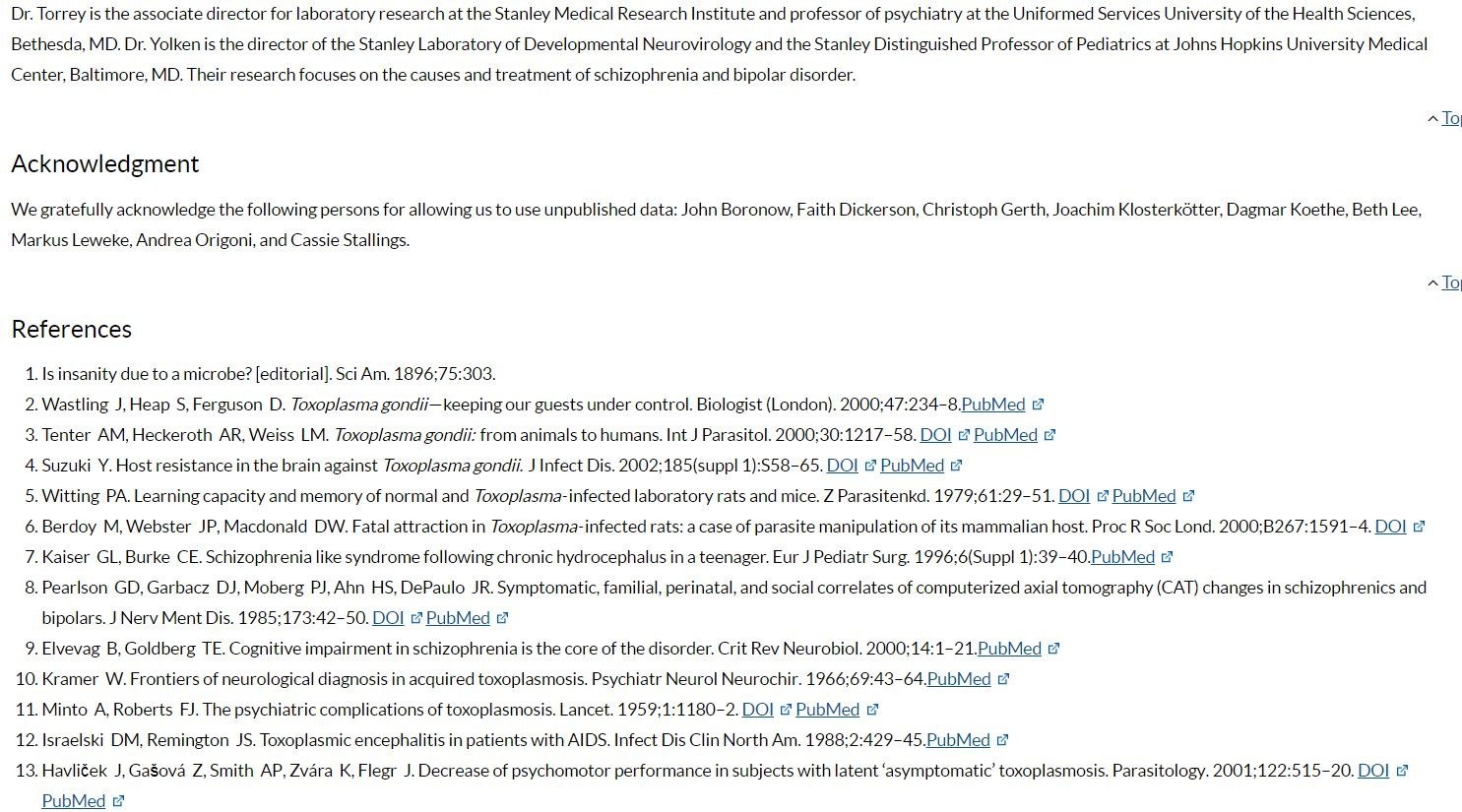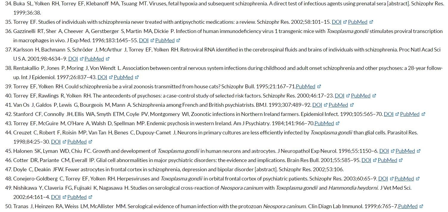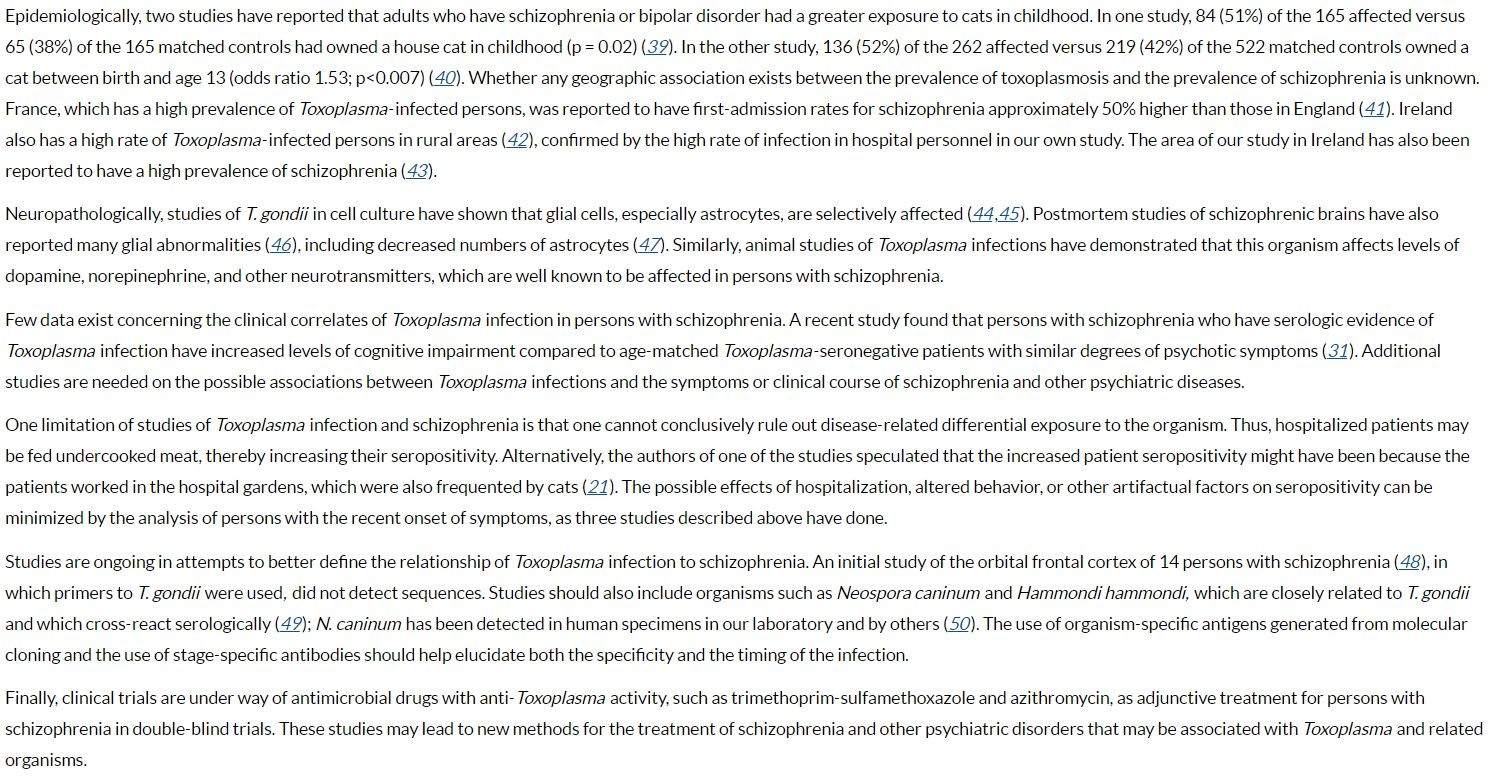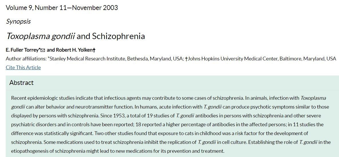 Yolken RH, Bachmann S, Rouslanova I, Lillehoj E, Ford G, Torrey EF, Antibodies to Toxoplasma gondii in individuals with first-episode schizophrenia. Clin Infect Dis. 2001;32:842–4. DOIPubMed