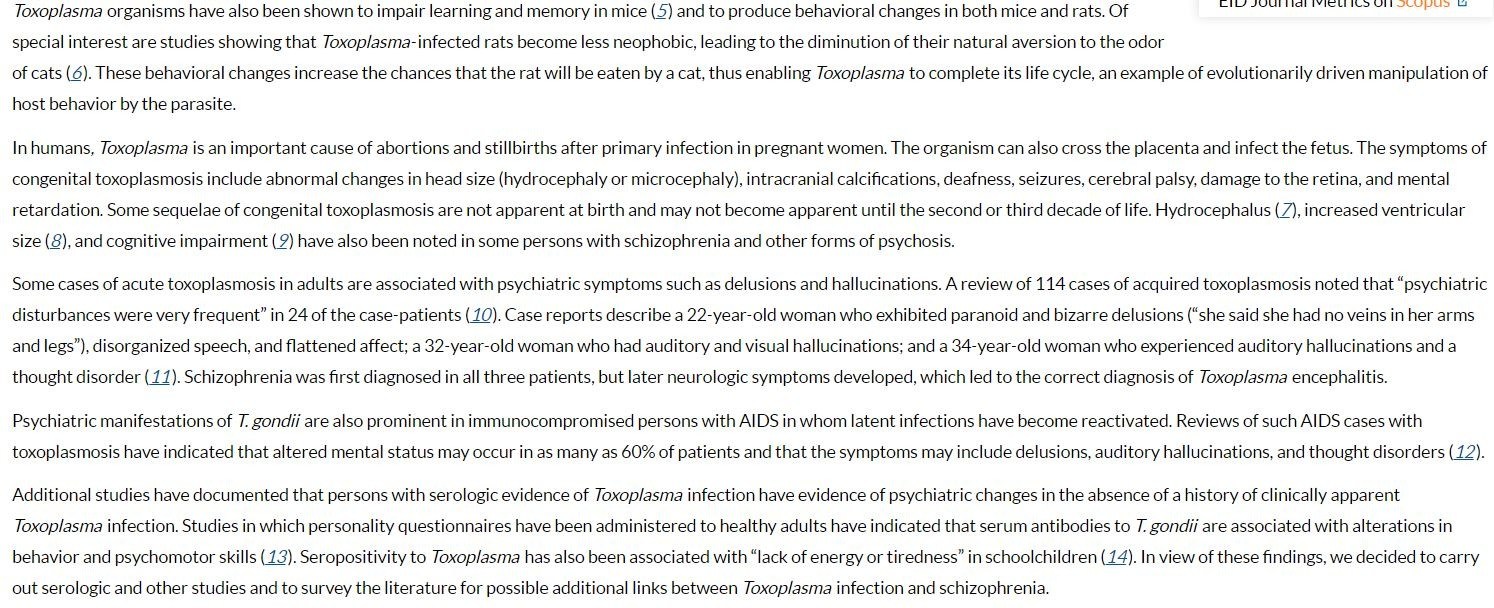 Additional studies have documented that persons with serologic evidence of Toxoplasma infection have evidence of psychiatric changes in the absence of a history of clinically apparent Toxoplasma infection. Studies in which personality questionnaires have been administered to healthy adults have indicated that serum antibodies to T. gondii are associated with alterations in behavior and psychomotor skills (13). Seropositivity to Toxoplasma has also been associated with “lack of energy or tiredness” in schoolchildren (14). In view of these findings, we decided to carry out serologic and other studies and to survey the literature for possible additional links between Toxoplasma infection and schizophrenia.