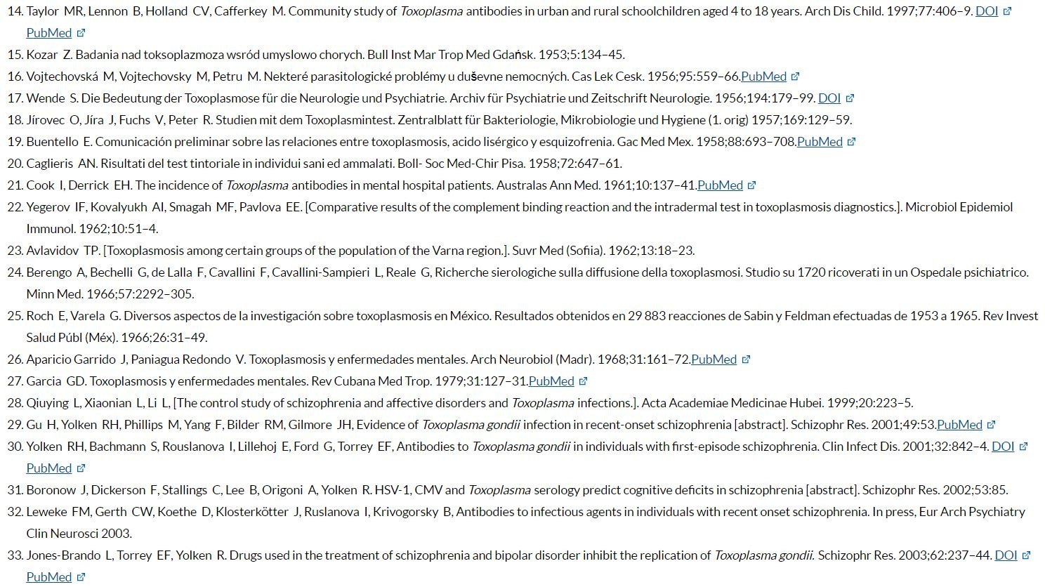 Aparicio Garrido J, Paniagua Redondo V. Toxoplasmosis y enfermedades mentales. Arch Neurobiol (Madr). 1968;31:161–72.PubMed
