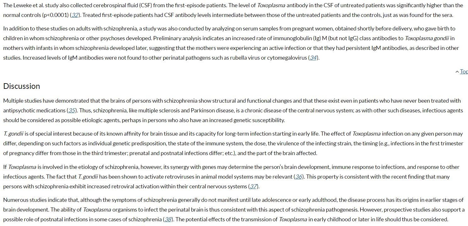 Gu H, Yolken RH, Phillips M, Yang F, Bilder RM, Gilmore JH, Evidence of Toxoplasma gondii infection in recent-onset schizophrenia [abstract]. Schizophr Res. 2001;49:53.PubMed
