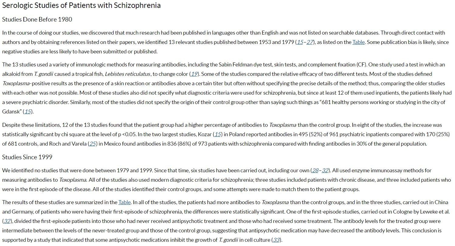 Despite these limitations, 12 of the 13 studies found that the patient group had a higher percentage of antibodies to Toxoplasma than the control group. In eight of the studies, the increase was statistically significant by chi square at the level of p <0.05. In the two largest studies, Kozar (15) in Poland reported antibodies in 495 (52%) of 961 psychiatric inpatients compared with 170 (25%) of 681 controls, and Roch and Varela (25) in Mexico found antibodies in 836 (86%) of 973 patients with schizophrenia compared with finding antibodies in 30% of the general population.