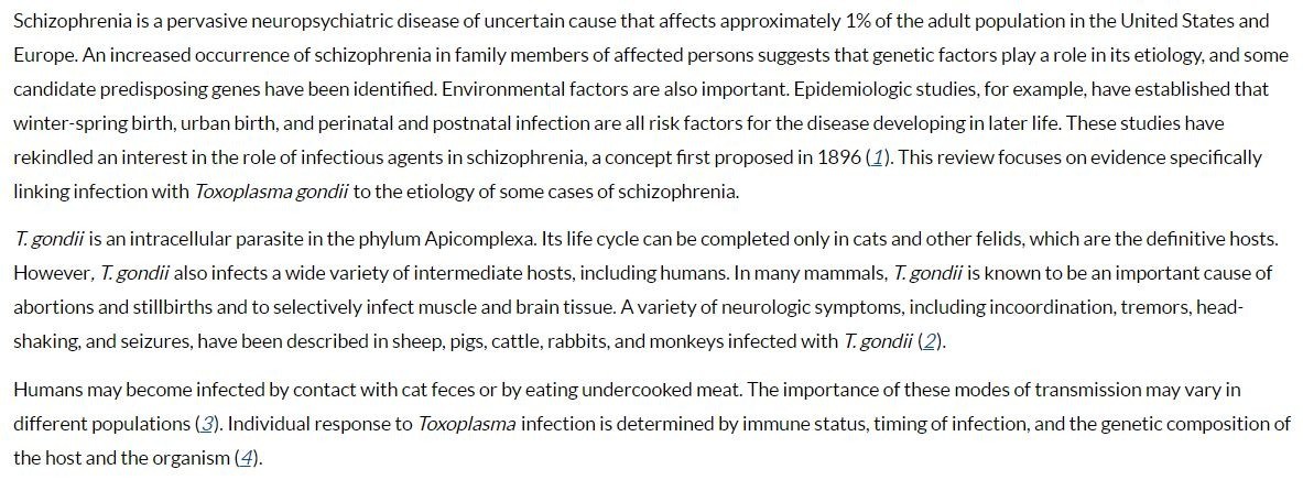 Schizophrenia is a pervasive neuropsychiatric disease of uncertain cause that affects approximately 1% of the adult population in the United States and Europe. An increased occurrence of schizophrenia in family members of affected persons suggests that genetic factors play a role in its etiology, and some candidate predisposing genes have been identified. Environmental factors are also important. Epidemiologic studies, for example, have established that winter-spring birth, urban birth, and perinatal and postnatal infection are all risk factors for the disease developing in later life. These studies have rekindled an interest in the role of infectious agents in schizophrenia, a concept first proposed in 1896 (1). This review focuses on evidence specifically linking infection with Toxoplasma gondii to the etiology of some cases of schizophrenia.