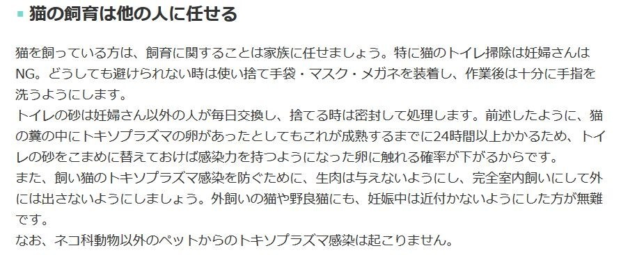 猫を飼っている方は、飼育に関することは家族に任せましょう。特に猫のトイレ掃除は妊婦さんはNG。どうしても避けられない時は使い捨て手袋・マスク・メガネを装着し、作業後は十分に手指を洗うようにします。