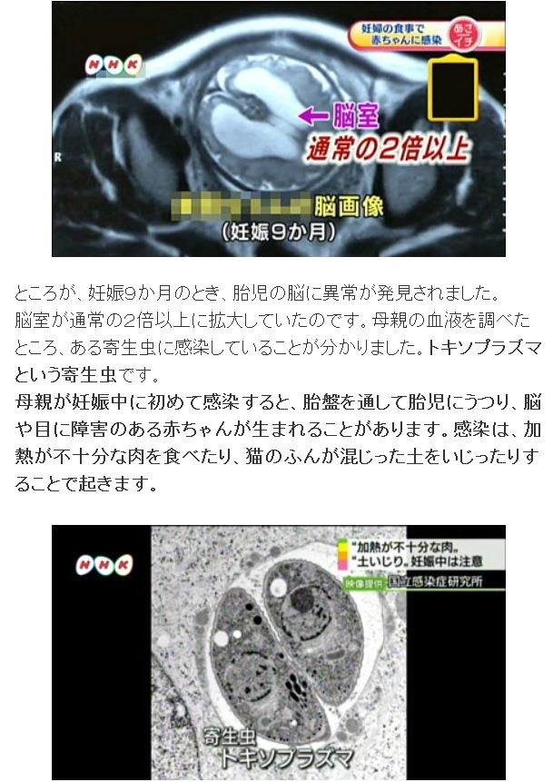 脳室が通常の2倍以上に拡大していたのです。母親の血液を調べたところ、ある寄生虫に感染していることが分かりました。トキソプラズマという寄生虫です。
