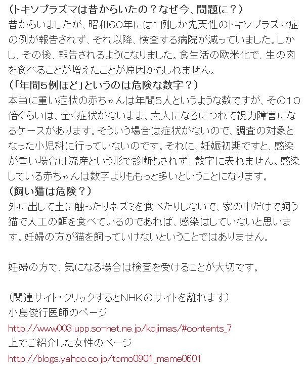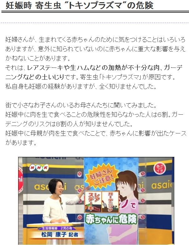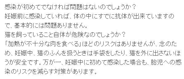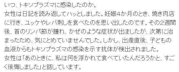 検査も大事ですが、やはり妊娠が分かったら、肉は十分加熱するなどの対策を徹底してほしいと思います。