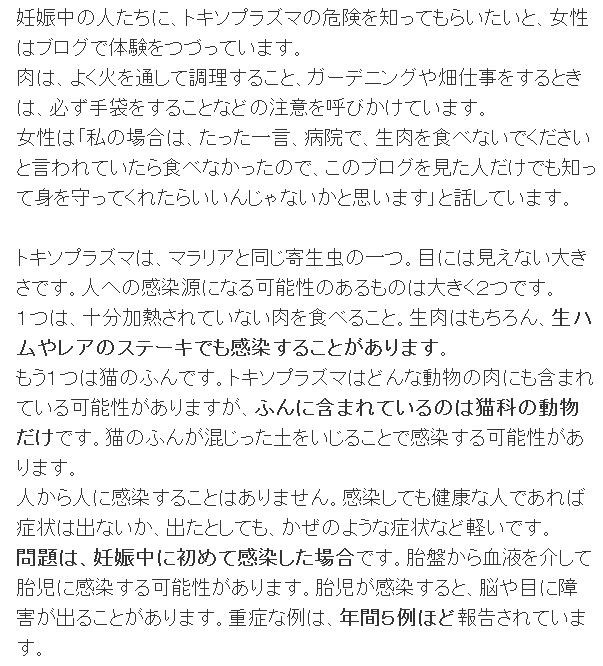妊娠中の人たちに、トキソプラズマの危険を知ってもらいたいと、女性はブログで体験をつづっています。