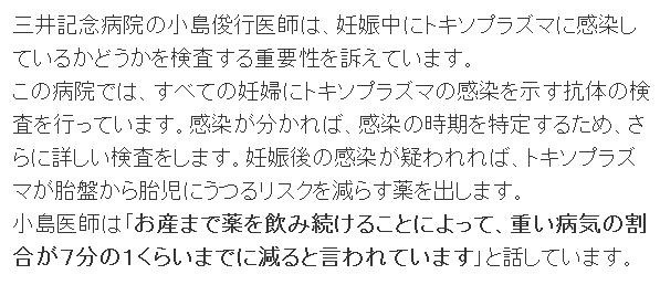 三井記念病院の小島俊行医師は、妊娠中にトキソプラズマに感染しているかどうかを検査する重要性を訴えています。