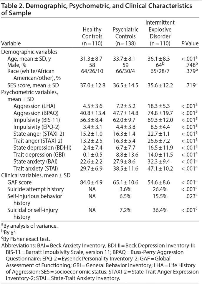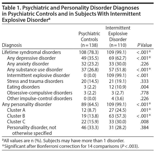 After diagnostic assignment, 110 subjects had no evidence of any psychiatric diagnosis (healthy controls); 138 subjects met criteria for a lifetime diagnosis of a syndromal psychiatric or personality disorder, but not for a lifetime diagnosis of IED (psychiatric controls); and 110 subjects met criteria for a lifetime diagnosis of IED. Of the 248 subjects with any DSM-5 diagnosis, most (72.4%) reported (1) a history of formal psychiatric evaluation and/or treatment (46.3%) or (2) a history of behavioral disturbance during which the subjects, or others, thought they should have sought mental health services but did not (26.1%). Syndromal psychiatric and personality disorder diagnoses are listed in Table 1.