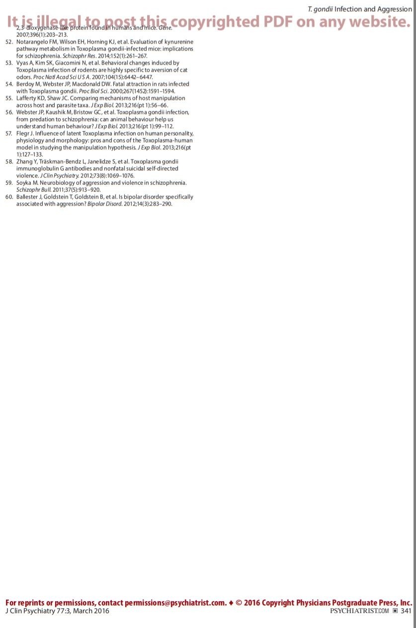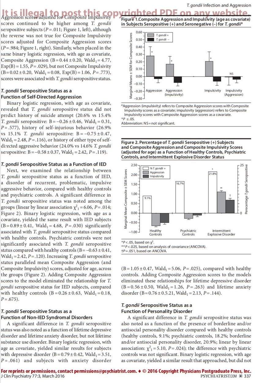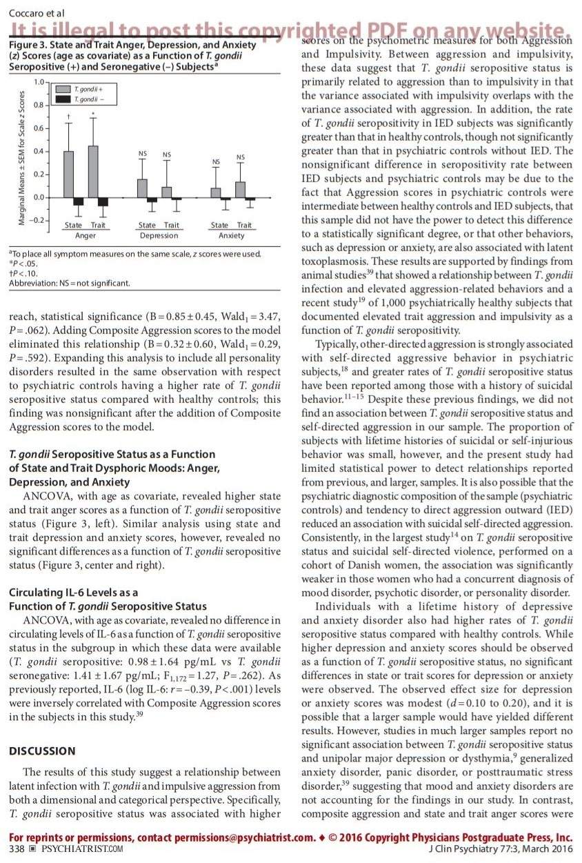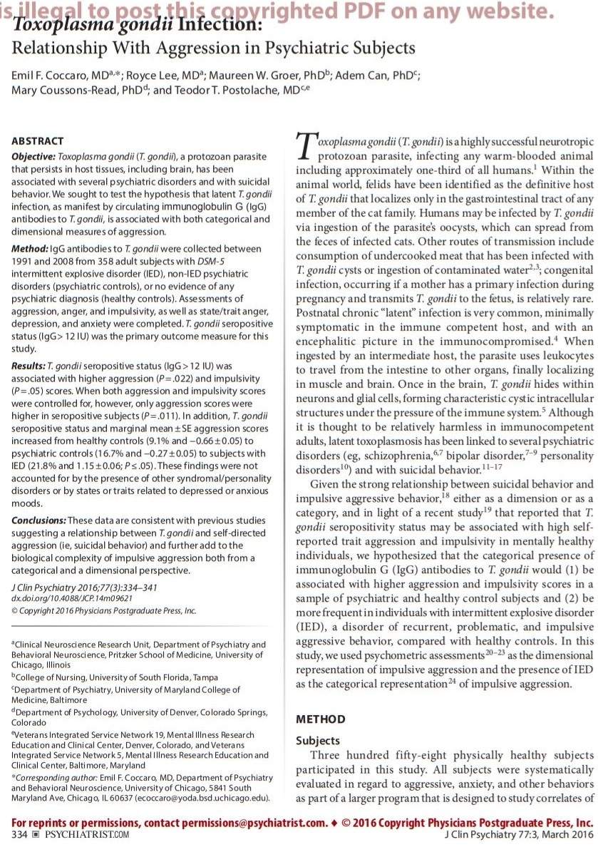 19. Cook TB, Brenner LA, Cloninger CR, et al. “Latent” infection with Toxoplasma gondii: association with trait aggression and impulsivity in healthy adults. J Psychiatr Res. 2015;60:87–94. PubMed doi:10.1016/j.jpsychires.2014.09.019 Show Abstract